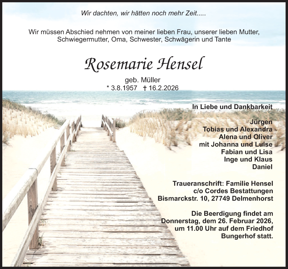 Hier finden Sie alle Traueranzeigen aus der Zeitung, die bisher für Rosemarie Hensel erschienen sind. Weitere Traueranzeigen, die in der Zeitung erscheinen, werden hier ebenfalls aufgelistet