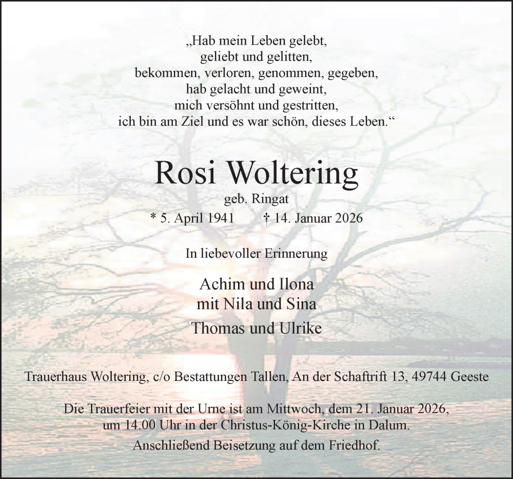 Hier finden Sie alle Traueranzeigen aus der Zeitung, die bisher für Rosi Woltering erschienen sind. Weitere Traueranzeigen, die in der Zeitung erscheinen, werden hier ebenfalls aufgelistet