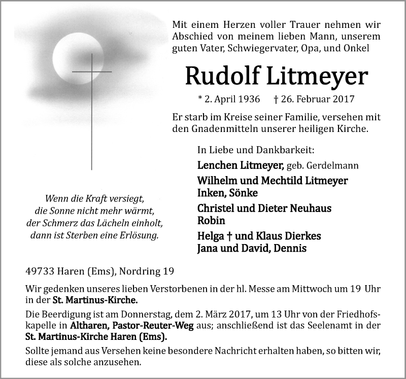 Hier finden Sie alle Traueranzeigen aus der Zeitung, die bisher für Rudolf Litmeyer erschienen sind. Weitere Traueranzeigen, die in der Zeitung erscheinen, werden hier ebenfalls aufgelistet