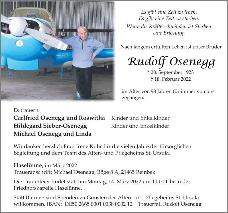 Hier finden Sie alle Traueranzeigen aus der Zeitung, die bisher für Rudolf Osenegg erschienen sind. Weitere Traueranzeigen, die in der Zeitung erscheinen, werden hier ebenfalls aufgelistet