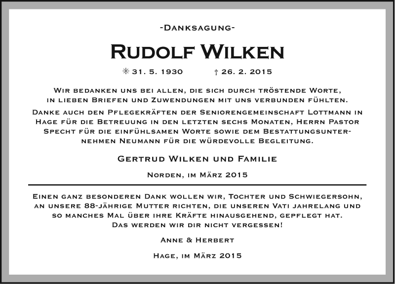 Hier finden Sie alle Traueranzeigen aus der Zeitung, die bisher für Rudolf Wilken erschienen sind. Weitere Traueranzeigen, die in der Zeitung erscheinen, werden hier ebenfalls aufgelistet