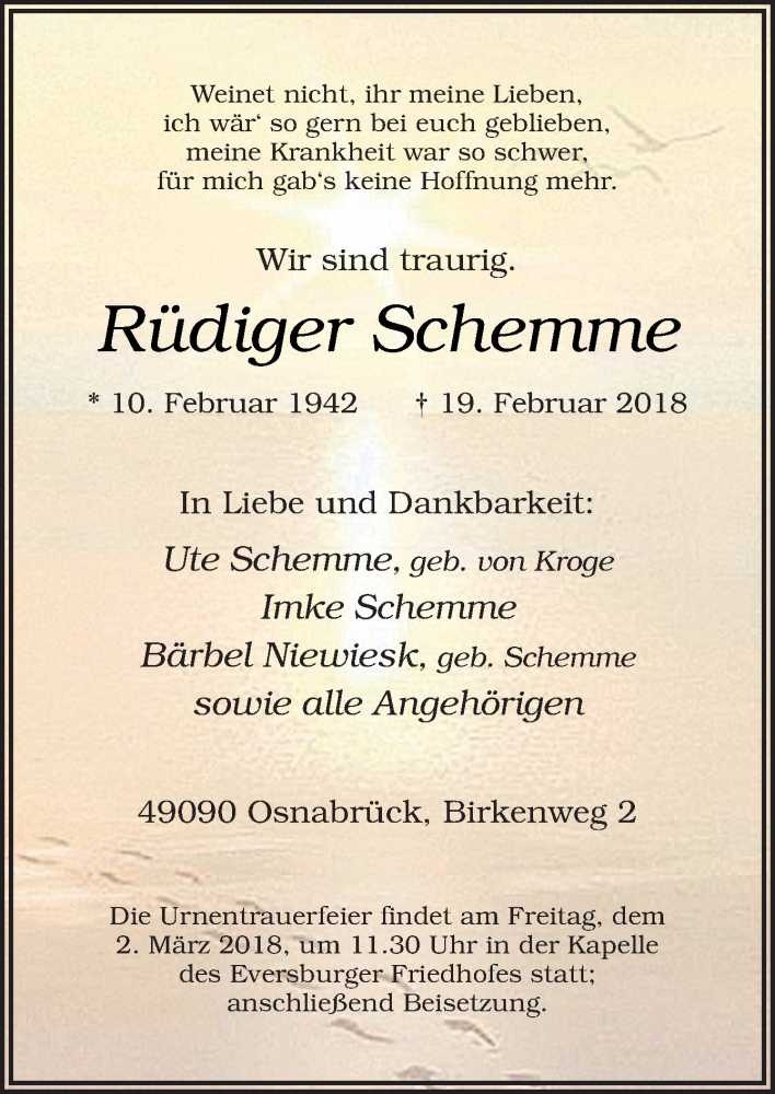 Hier finden Sie alle Traueranzeigen aus der Zeitung, die bisher für Rüdiger Schemme erschienen sind. Weitere Traueranzeigen, die in der Zeitung erscheinen, werden hier ebenfalls aufgelistet