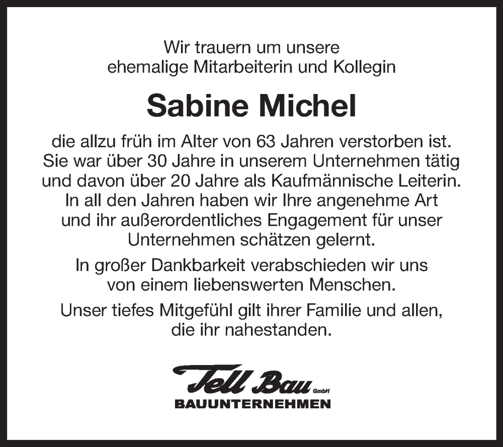 Hier finden Sie alle Traueranzeigen aus der Zeitung, die bisher für Sabine Michel erschienen sind. Weitere Traueranzeigen, die in der Zeitung erscheinen, werden hier ebenfalls aufgelistet