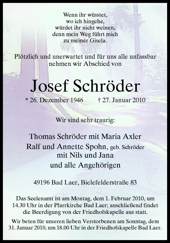 Hier finden Sie alle Traueranzeigen aus der Zeitung, die bisher für Josef Schröder erschienen sind. Weitere Traueranzeigen, die in der Zeitung erscheinen, werden hier ebenfalls aufgelistet