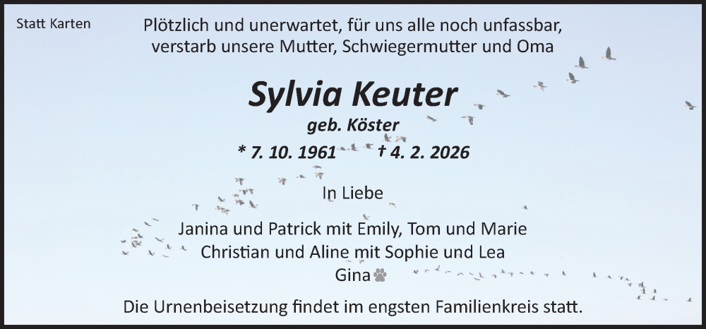 Hier finden Sie alle Traueranzeigen aus der Zeitung, die bisher für Sylvia Keuter erschienen sind. Weitere Traueranzeigen, die in der Zeitung erscheinen, werden hier ebenfalls aufgelistet