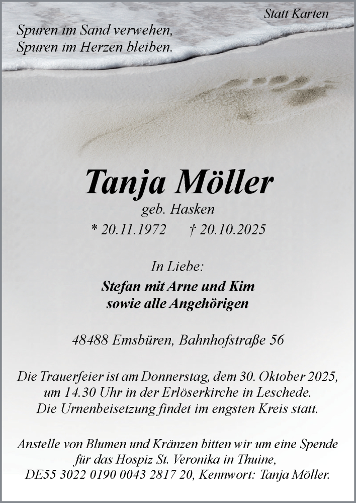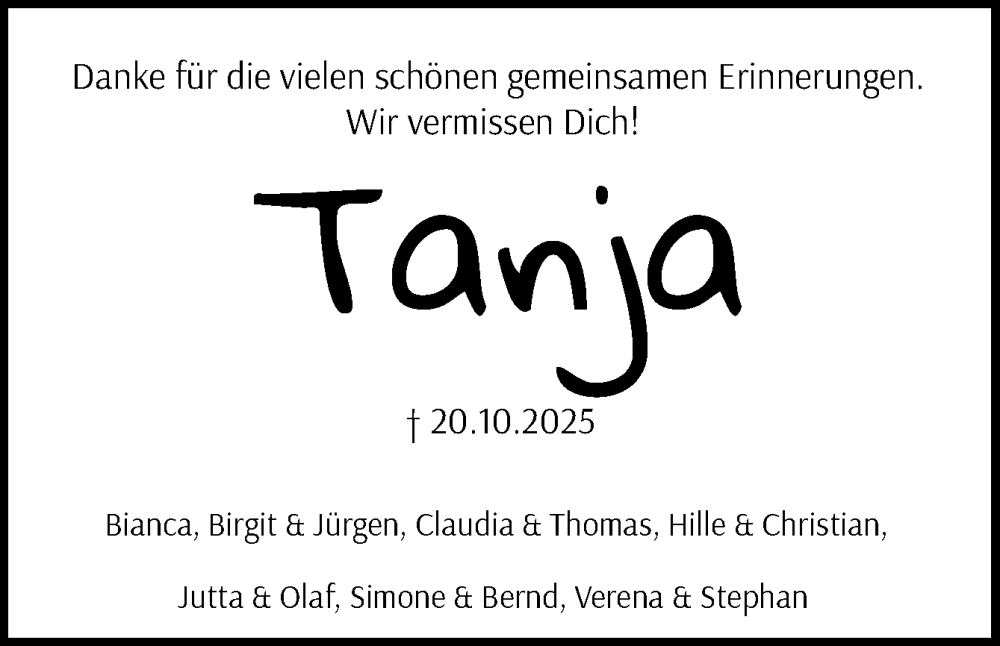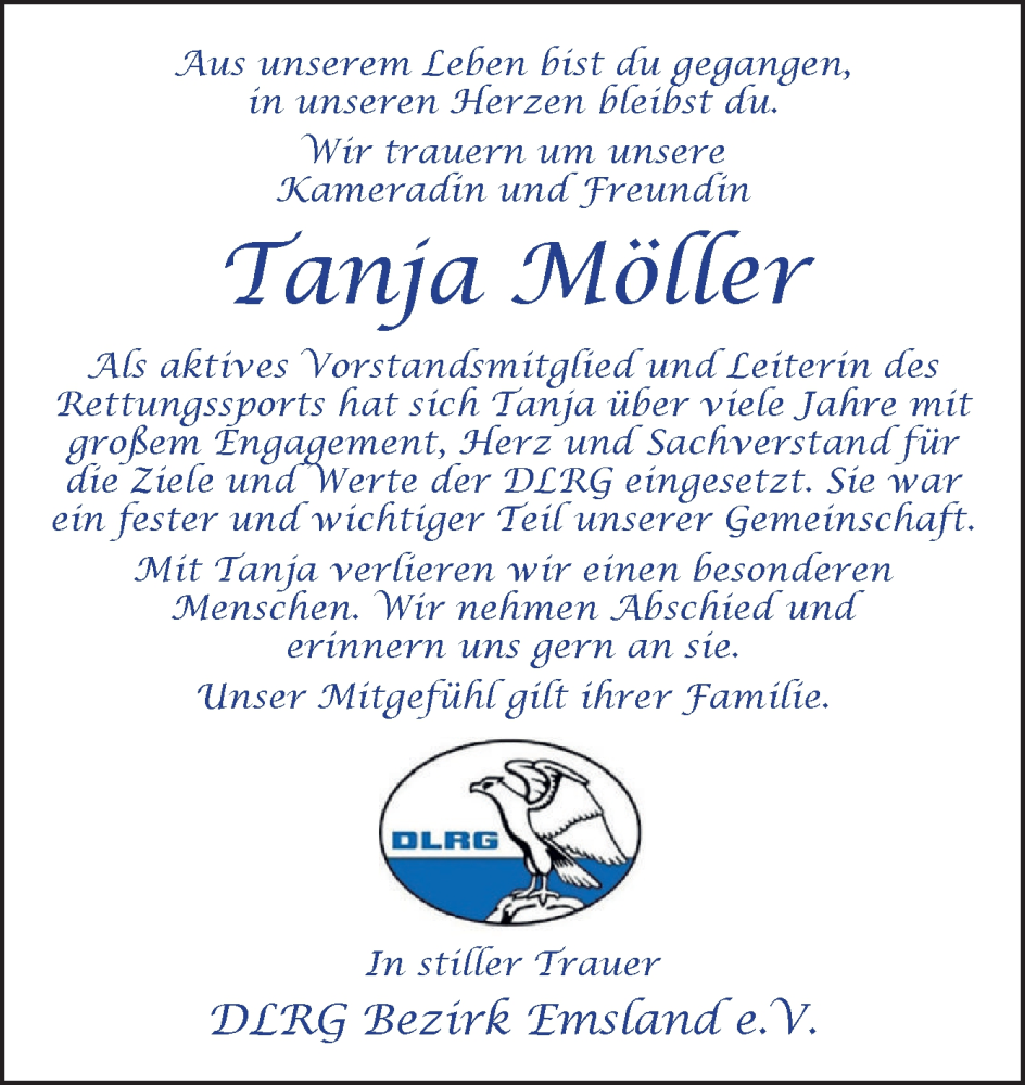 Hier finden Sie alle Traueranzeigen aus der Zeitung, die bisher für Tanja Möller erschienen sind. Weitere Traueranzeigen, die in der Zeitung erscheinen, werden hier ebenfalls aufgelistet