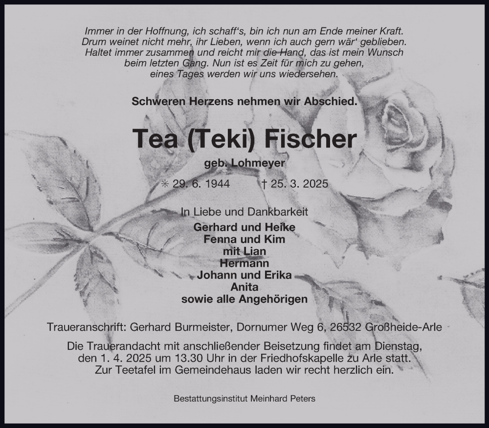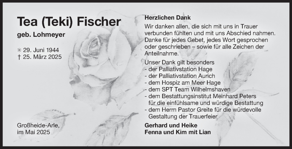 Hier finden Sie alle Traueranzeigen aus der Zeitung, die bisher für Tea Fischer erschienen sind. Weitere Traueranzeigen, die in der Zeitung erscheinen, werden hier ebenfalls aufgelistet