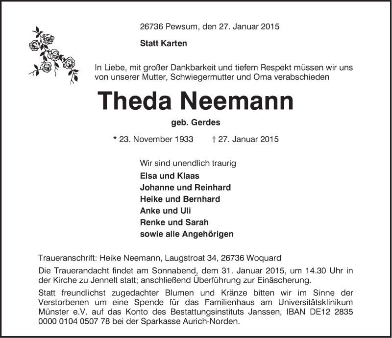 Hier finden Sie alle Traueranzeigen aus der Zeitung, die bisher für Theda Neemann erschienen sind. Weitere Traueranzeigen, die in der Zeitung erscheinen, werden hier ebenfalls aufgelistet