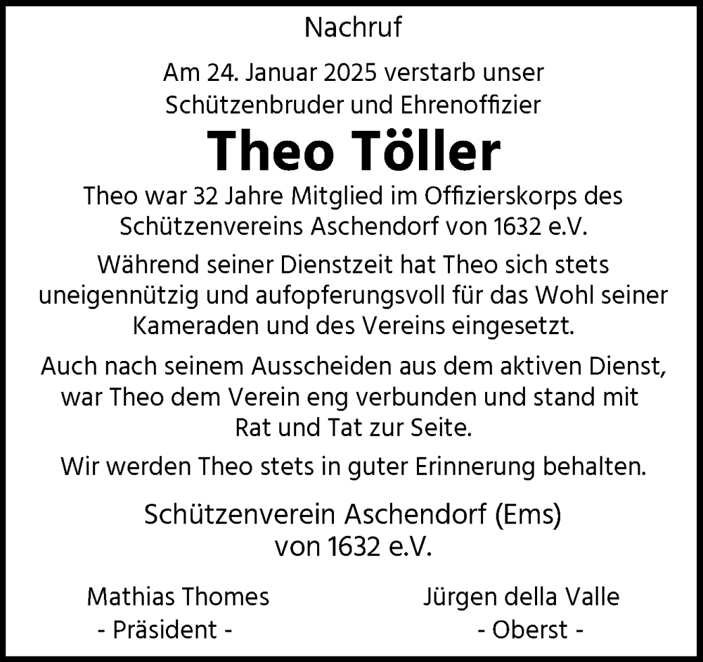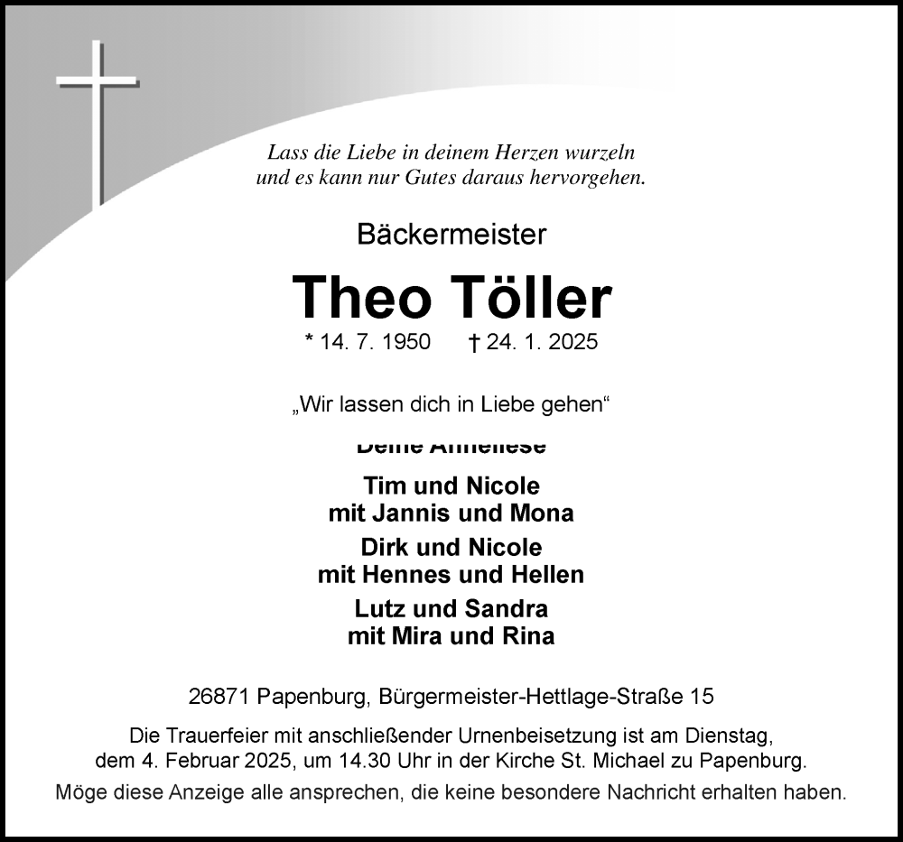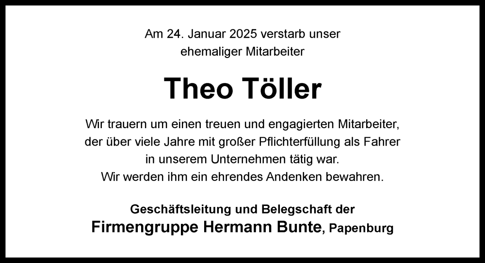 Hier finden Sie alle Traueranzeigen aus der Zeitung, die bisher für Theo Töller erschienen sind. Weitere Traueranzeigen, die in der Zeitung erscheinen, werden hier ebenfalls aufgelistet