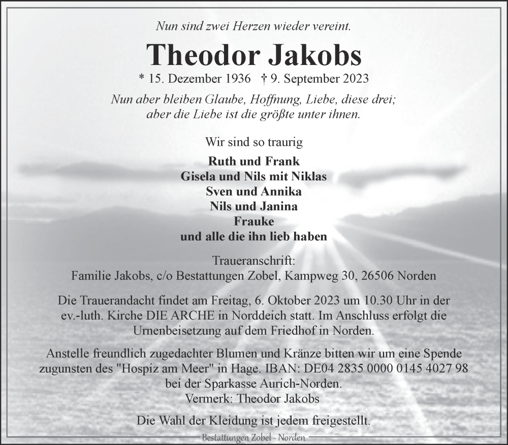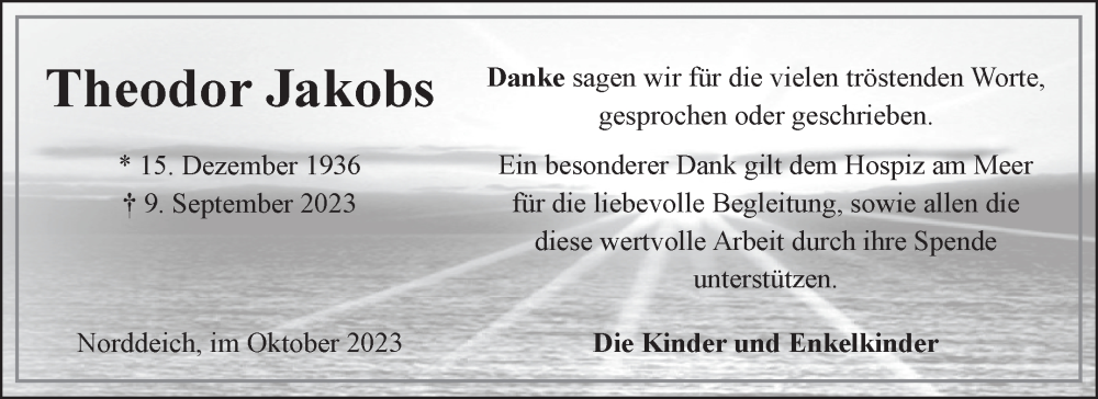 Hier finden Sie alle Traueranzeigen aus der Zeitung, die bisher für Theodor Jakobs erschienen sind. Weitere Traueranzeigen, die in der Zeitung erscheinen, werden hier ebenfalls aufgelistet