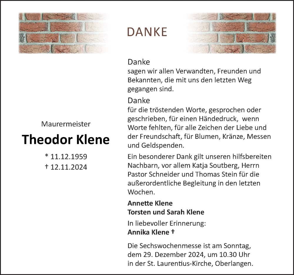 Hier finden Sie alle Traueranzeigen aus der Zeitung, die bisher für Theodor Klene erschienen sind. Weitere Traueranzeigen, die in der Zeitung erscheinen, werden hier ebenfalls aufgelistet