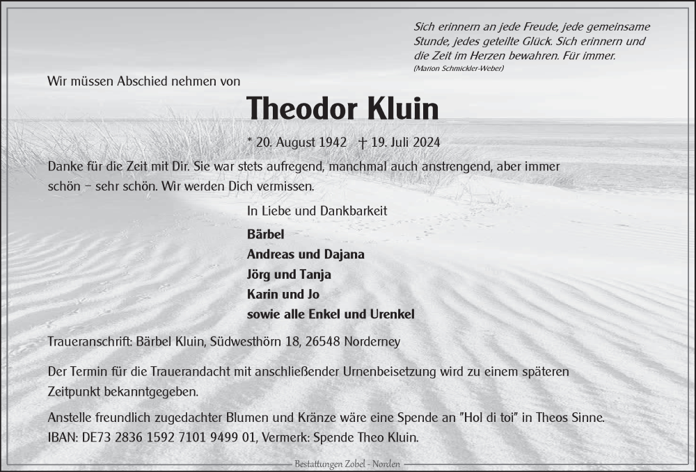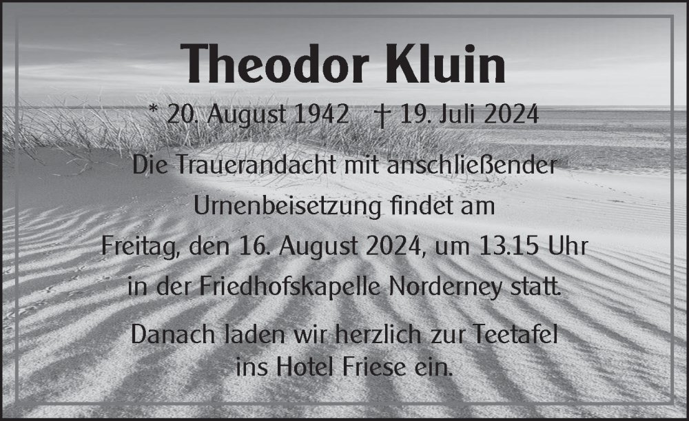 Hier finden Sie alle Traueranzeigen aus der Zeitung, die bisher für Theodor Kluin erschienen sind. Weitere Traueranzeigen, die in der Zeitung erscheinen, werden hier ebenfalls aufgelistet
