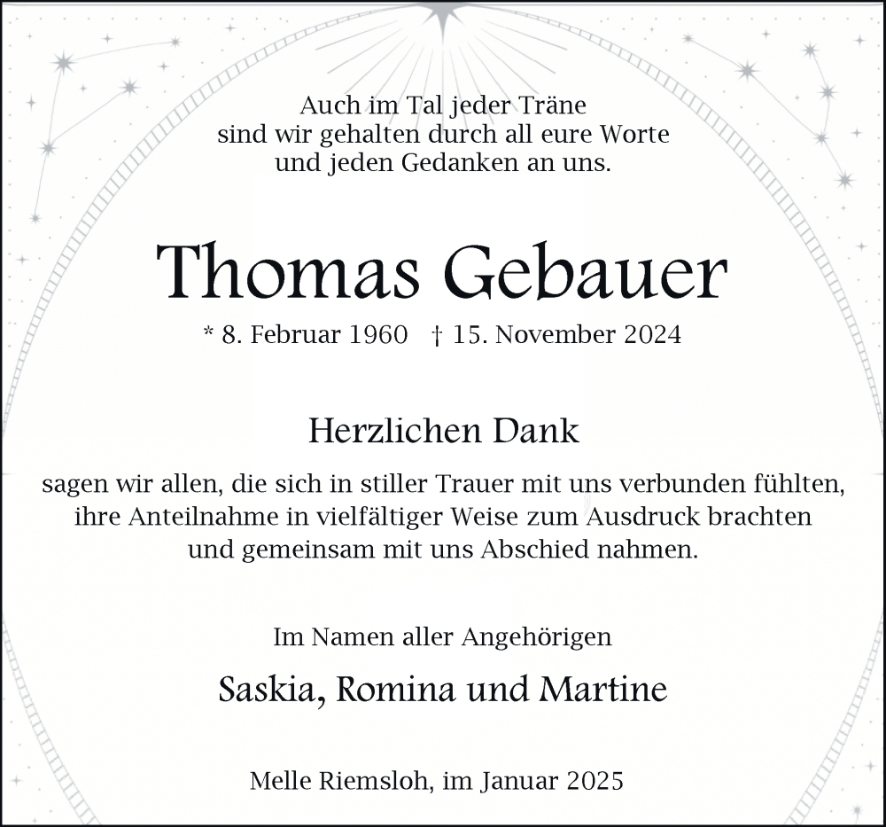 Hier finden Sie alle Traueranzeigen aus der Zeitung, die bisher für Thomas Gebauer erschienen sind. Weitere Traueranzeigen, die in der Zeitung erscheinen, werden hier ebenfalls aufgelistet