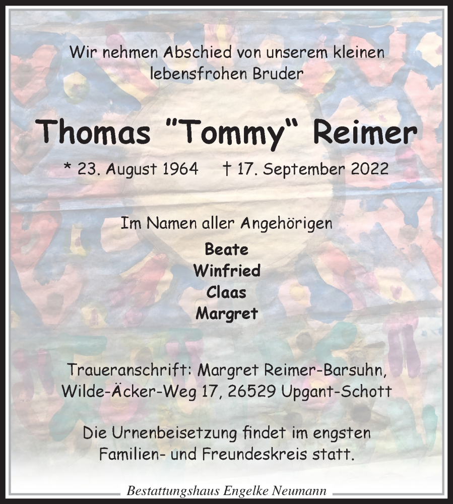 Hier finden Sie alle Traueranzeigen aus der Zeitung, die bisher für Thomas Reimer erschienen sind. Weitere Traueranzeigen, die in der Zeitung erscheinen, werden hier ebenfalls aufgelistet
