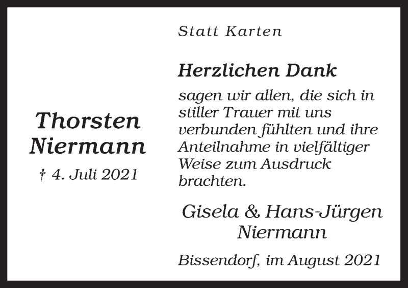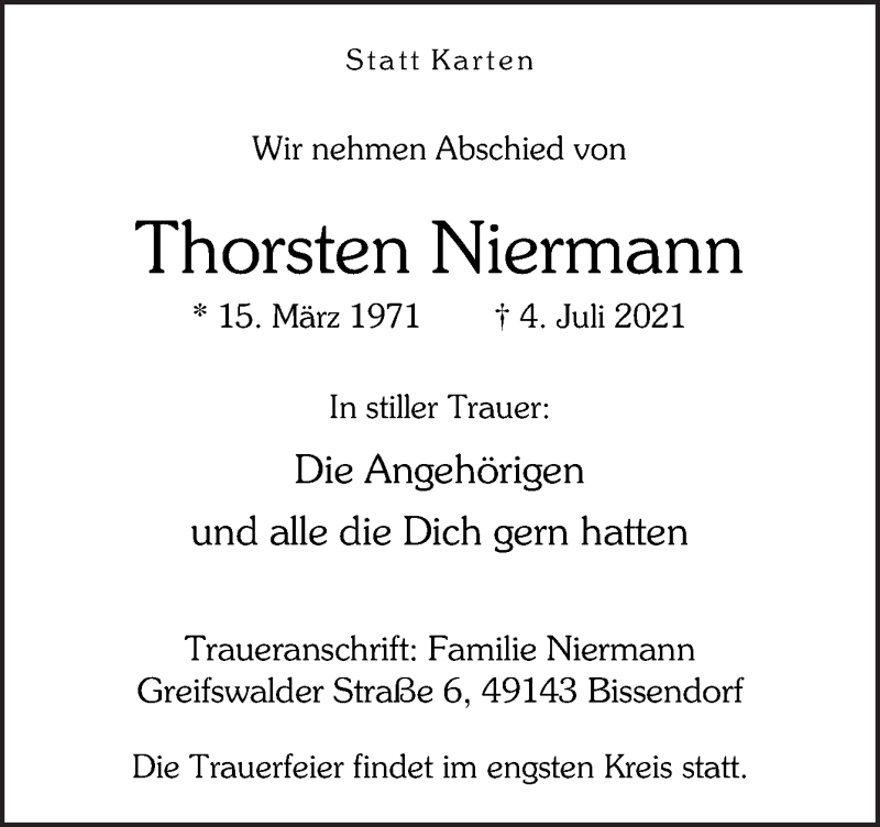Hier finden Sie alle Traueranzeigen aus der Zeitung, die bisher für Thorsten Niermann erschienen sind. Weitere Traueranzeigen, die in der Zeitung erscheinen, werden hier ebenfalls aufgelistet