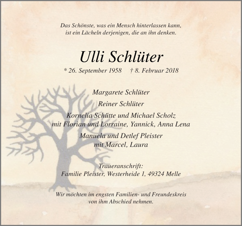Hier finden Sie alle Traueranzeigen aus der Zeitung, die bisher für Ulli Schlüter erschienen sind. Weitere Traueranzeigen, die in der Zeitung erscheinen, werden hier ebenfalls aufgelistet