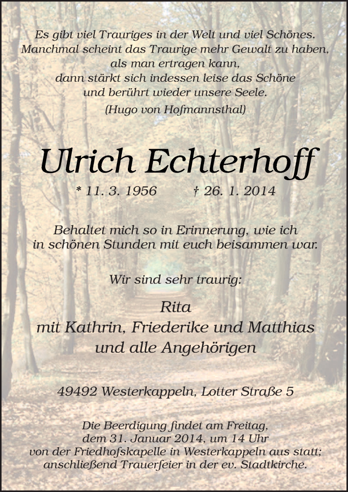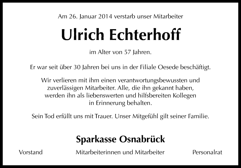 Hier finden Sie alle Traueranzeigen aus der Zeitung, die bisher für Ulrich Echterhoff erschienen sind. Weitere Traueranzeigen, die in der Zeitung erscheinen, werden hier ebenfalls aufgelistet
