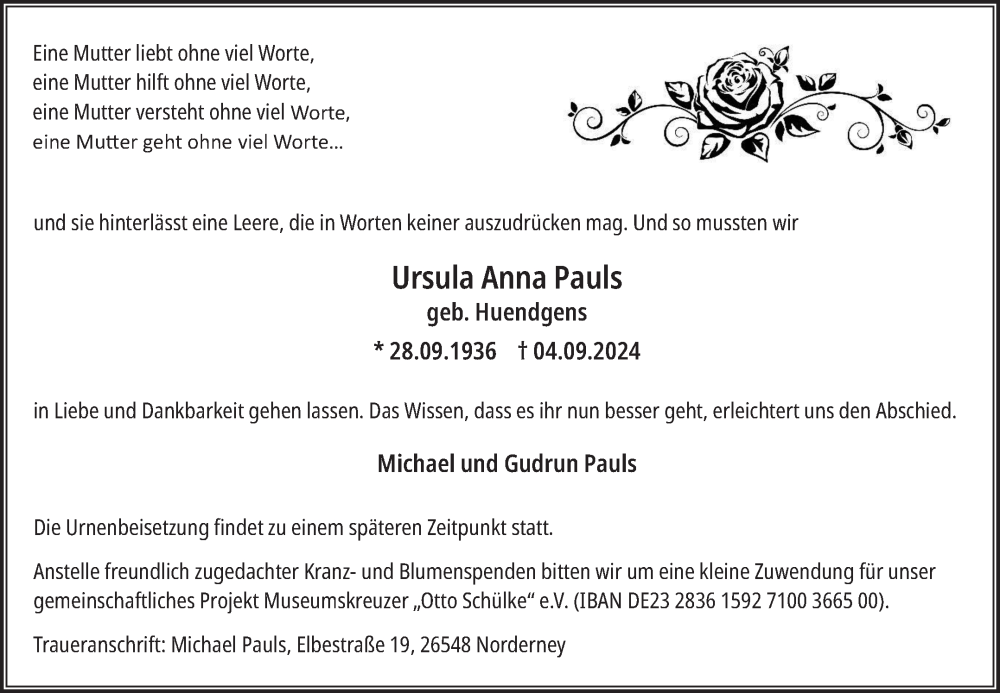 Hier finden Sie alle Traueranzeigen aus der Zeitung, die bisher für Ursula Anna Pauls erschienen sind. Weitere Traueranzeigen, die in der Zeitung erscheinen, werden hier ebenfalls aufgelistet
