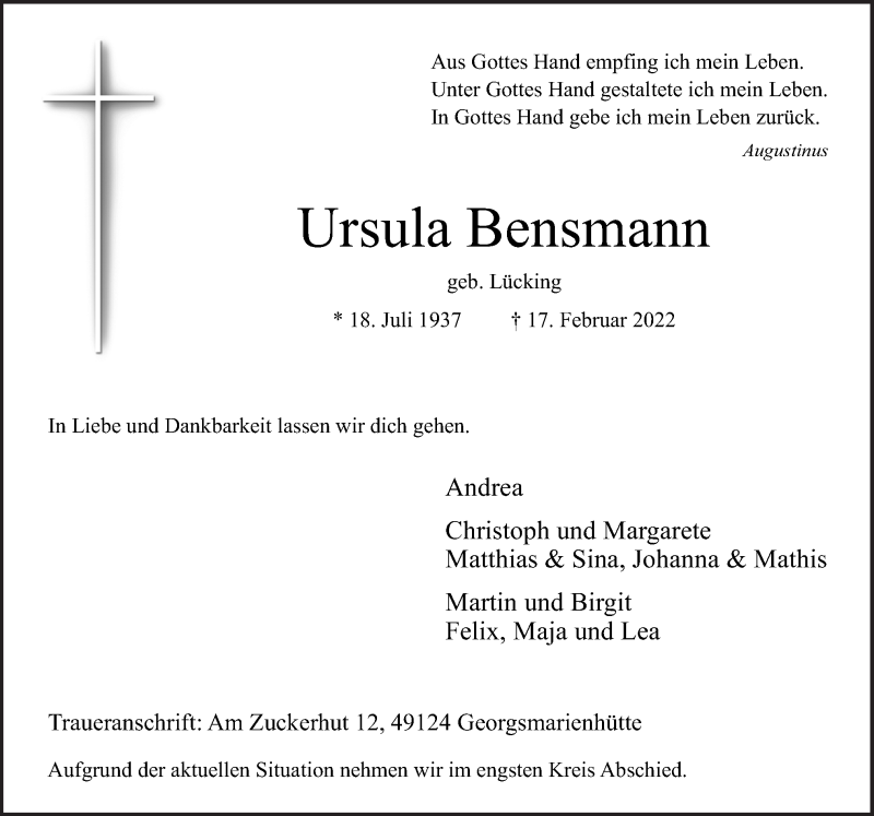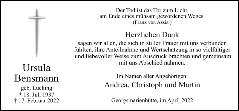 Hier finden Sie alle Traueranzeigen aus der Zeitung, die bisher für Ursula Bensmann erschienen sind. Weitere Traueranzeigen, die in der Zeitung erscheinen, werden hier ebenfalls aufgelistet