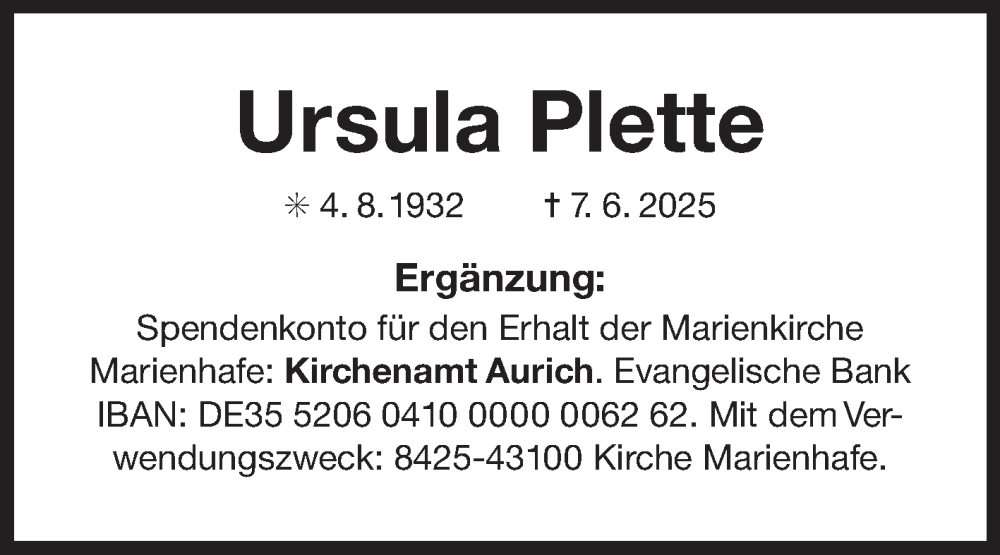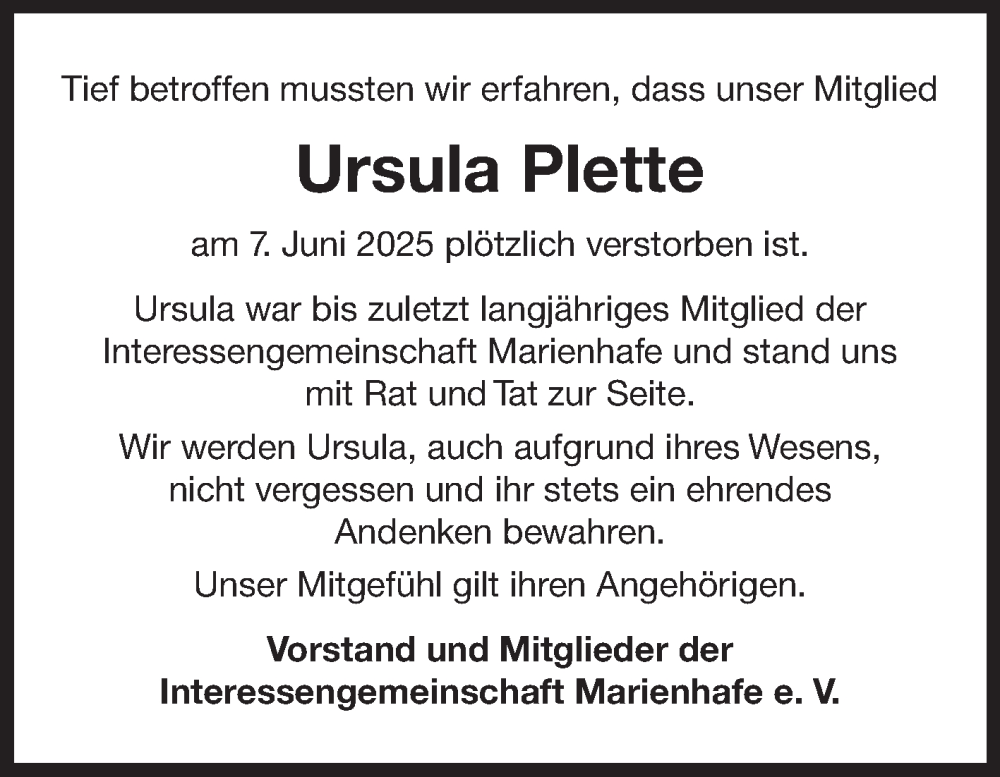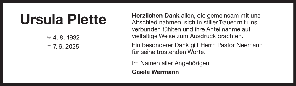 Hier finden Sie alle Traueranzeigen aus der Zeitung, die bisher für Ursula Plette erschienen sind. Weitere Traueranzeigen, die in der Zeitung erscheinen, werden hier ebenfalls aufgelistet