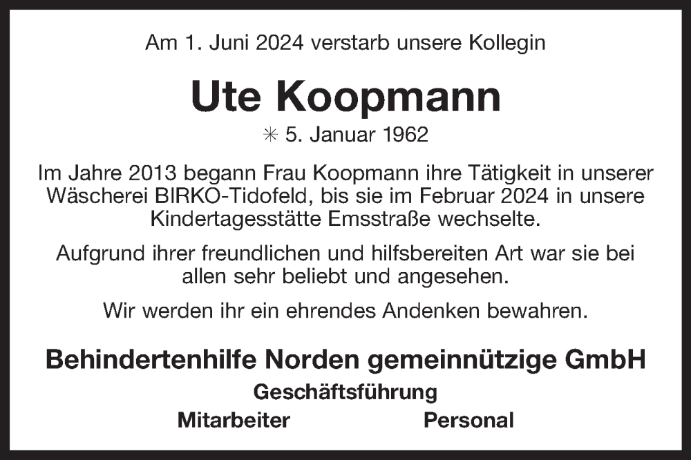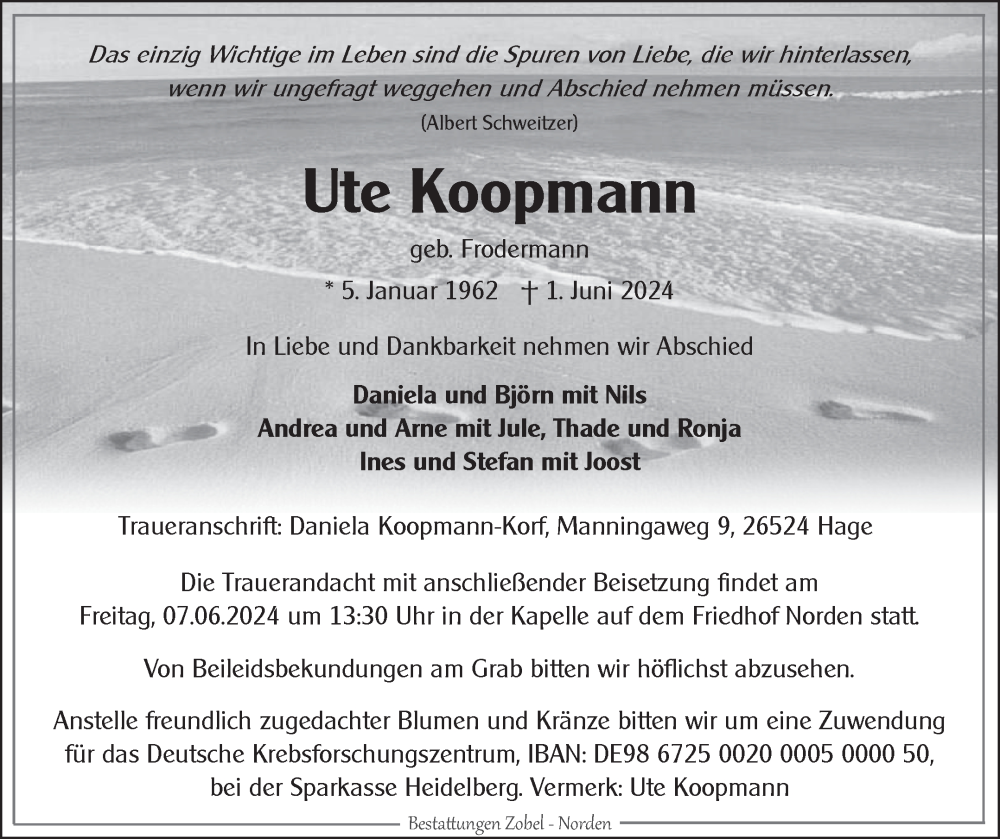 Hier finden Sie alle Traueranzeigen aus der Zeitung, die bisher für Ute Koopmann erschienen sind. Weitere Traueranzeigen, die in der Zeitung erscheinen, werden hier ebenfalls aufgelistet