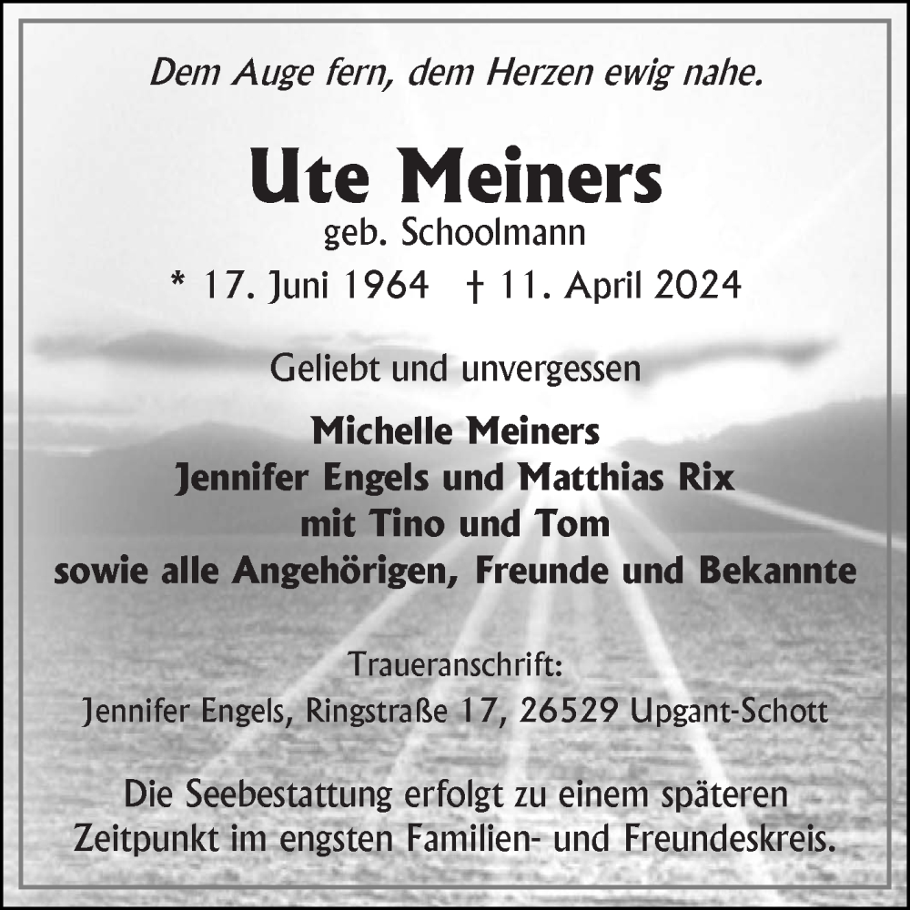 Hier finden Sie alle Traueranzeigen aus der Zeitung, die bisher für Ute Meiners erschienen sind. Weitere Traueranzeigen, die in der Zeitung erscheinen, werden hier ebenfalls aufgelistet