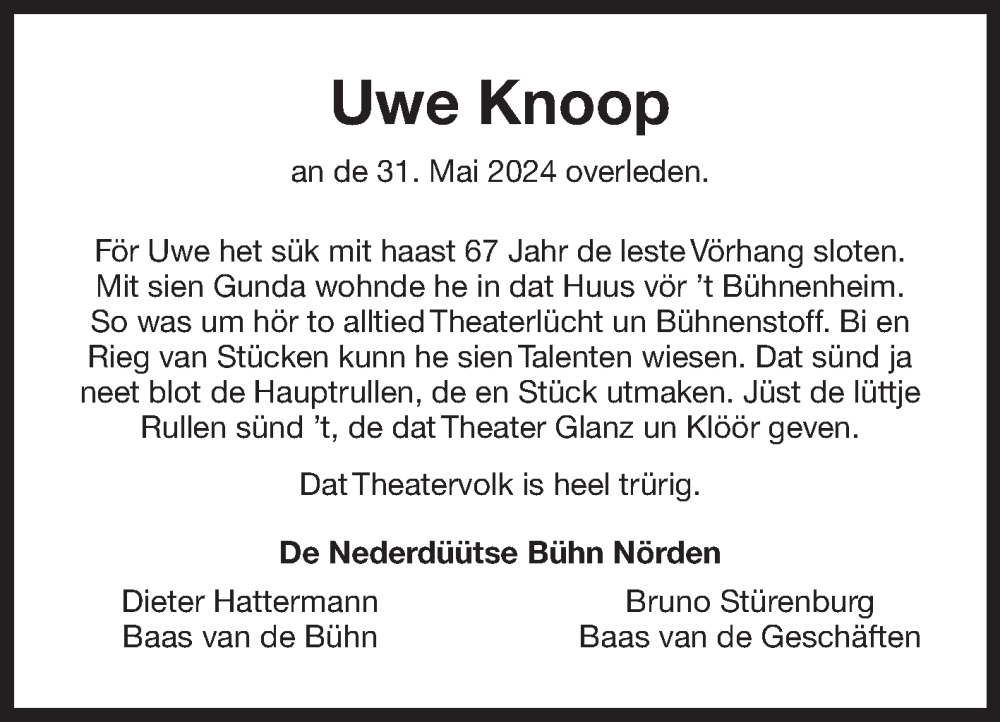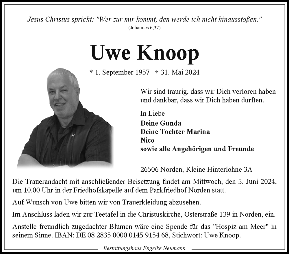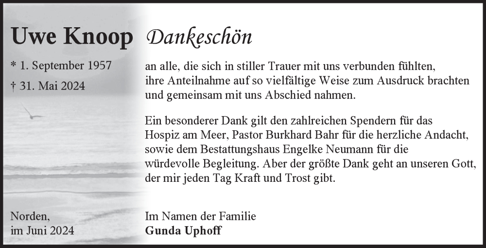 Hier finden Sie alle Traueranzeigen aus der Zeitung, die bisher für Uwe Knoop erschienen sind. Weitere Traueranzeigen, die in der Zeitung erscheinen, werden hier ebenfalls aufgelistet