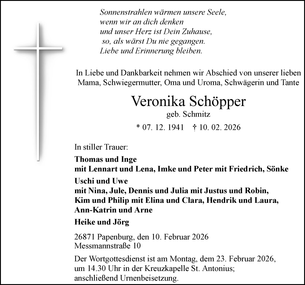 Hier finden Sie alle Traueranzeigen aus der Zeitung, die bisher für Veronika Schöpper erschienen sind. Weitere Traueranzeigen, die in der Zeitung erscheinen, werden hier ebenfalls aufgelistet