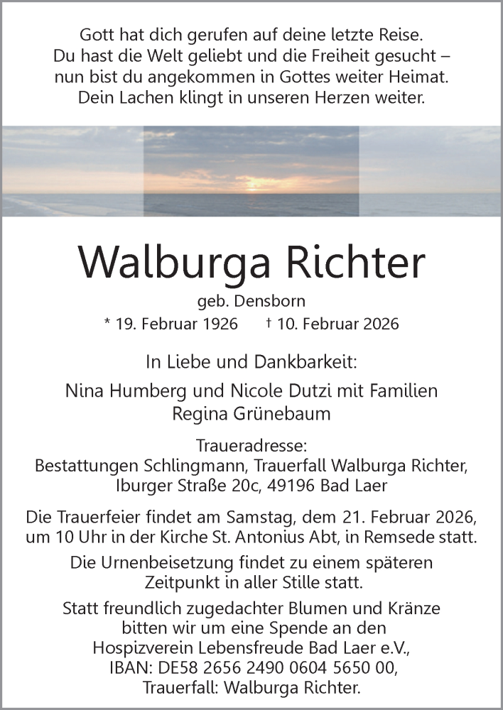 Hier finden Sie alle Traueranzeigen aus der Zeitung, die bisher für Walburga Richter erschienen sind. Weitere Traueranzeigen, die in der Zeitung erscheinen, werden hier ebenfalls aufgelistet