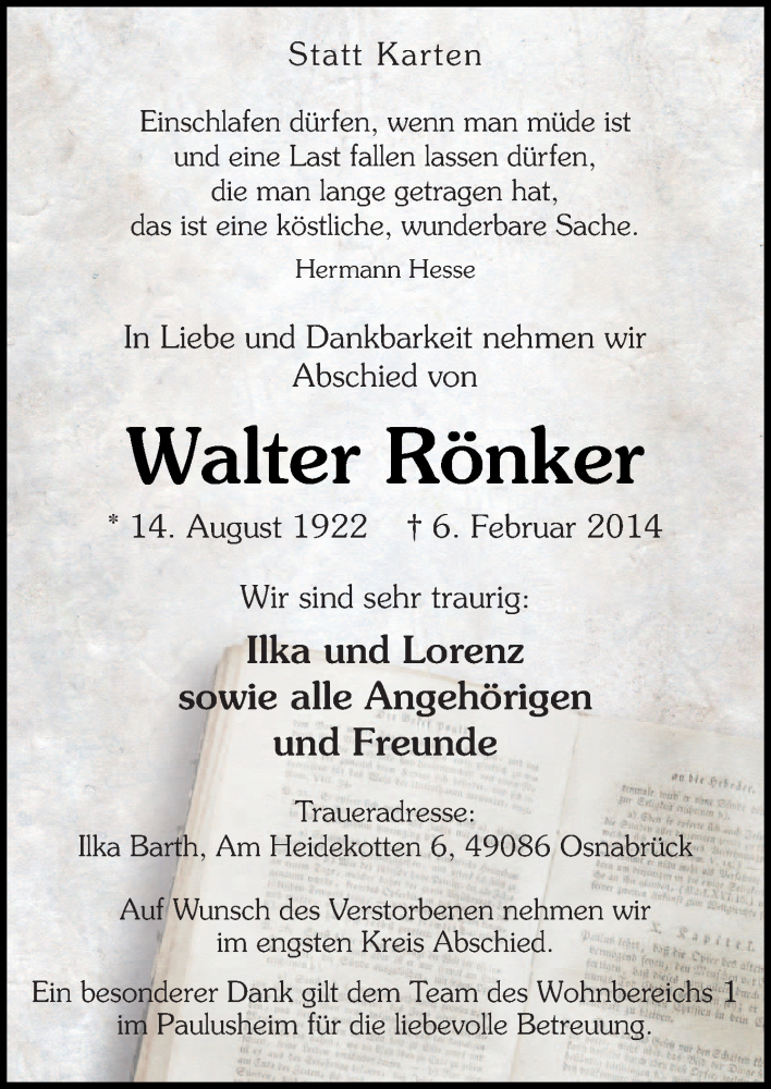 Hier finden Sie alle Traueranzeigen aus der Zeitung, die bisher für Walter Rönker erschienen sind. Weitere Traueranzeigen, die in der Zeitung erscheinen, werden hier ebenfalls aufgelistet