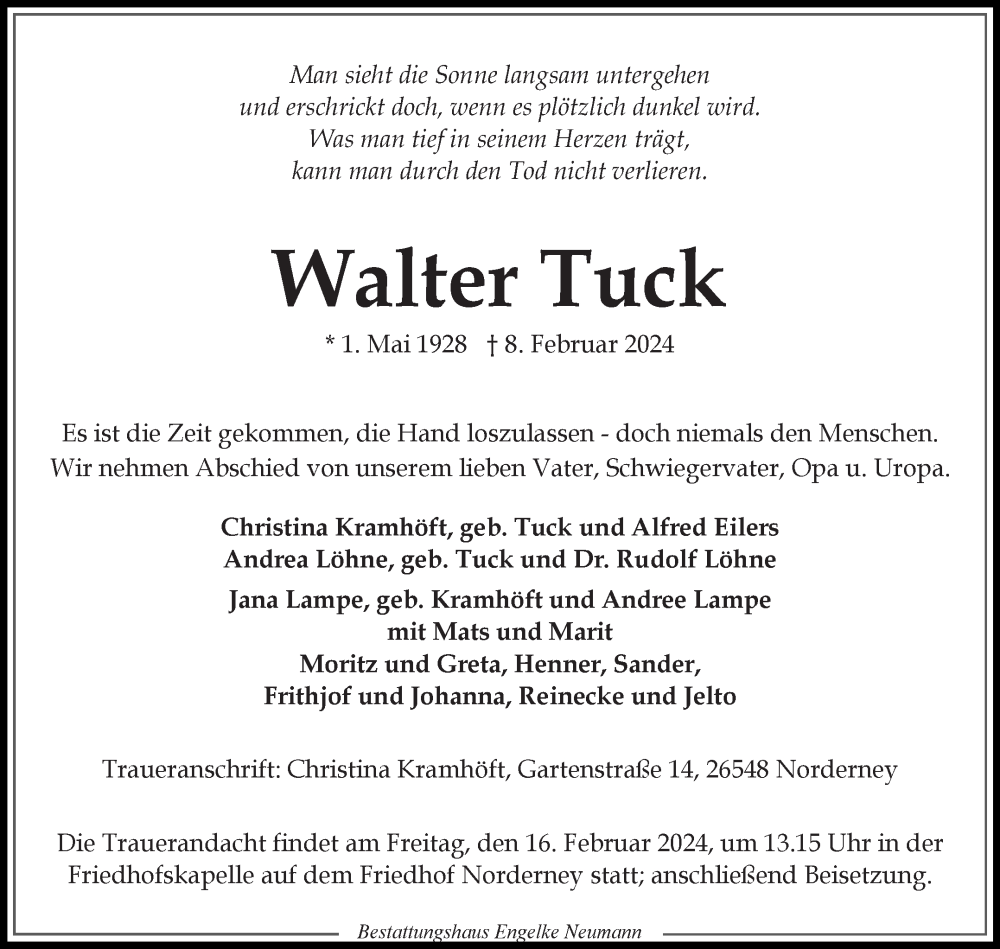 Hier finden Sie alle Traueranzeigen aus der Zeitung, die bisher für Walter Tuck erschienen sind. Weitere Traueranzeigen, die in der Zeitung erscheinen, werden hier ebenfalls aufgelistet
