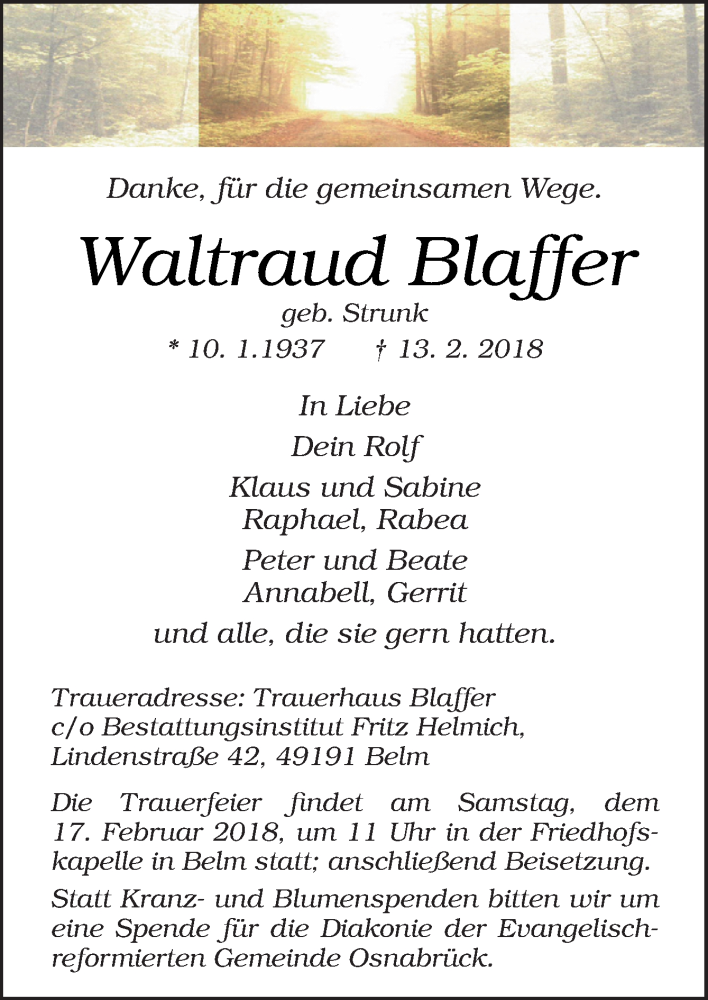 Hier finden Sie alle Traueranzeigen aus der Zeitung, die bisher für Waltraud Blaffer erschienen sind. Weitere Traueranzeigen, die in der Zeitung erscheinen, werden hier ebenfalls aufgelistet