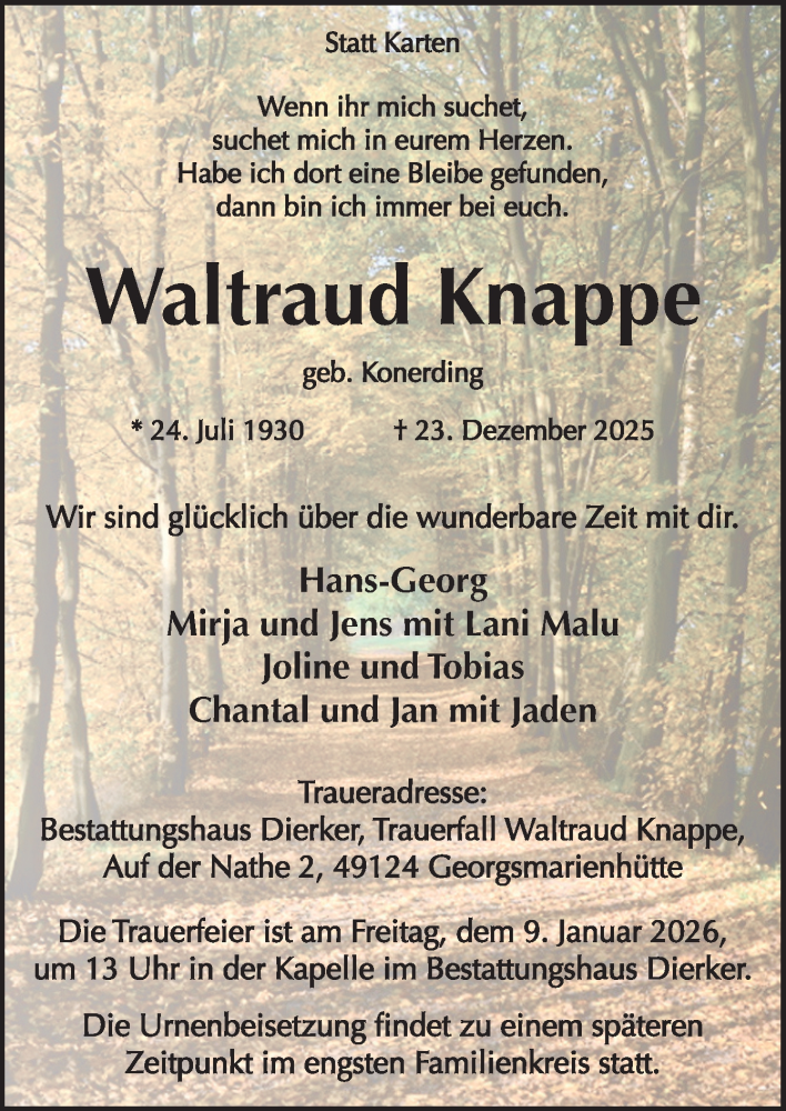 Hier finden Sie alle Traueranzeigen aus der Zeitung, die bisher für Waltraud Knappe erschienen sind. Weitere Traueranzeigen, die in der Zeitung erscheinen, werden hier ebenfalls aufgelistet