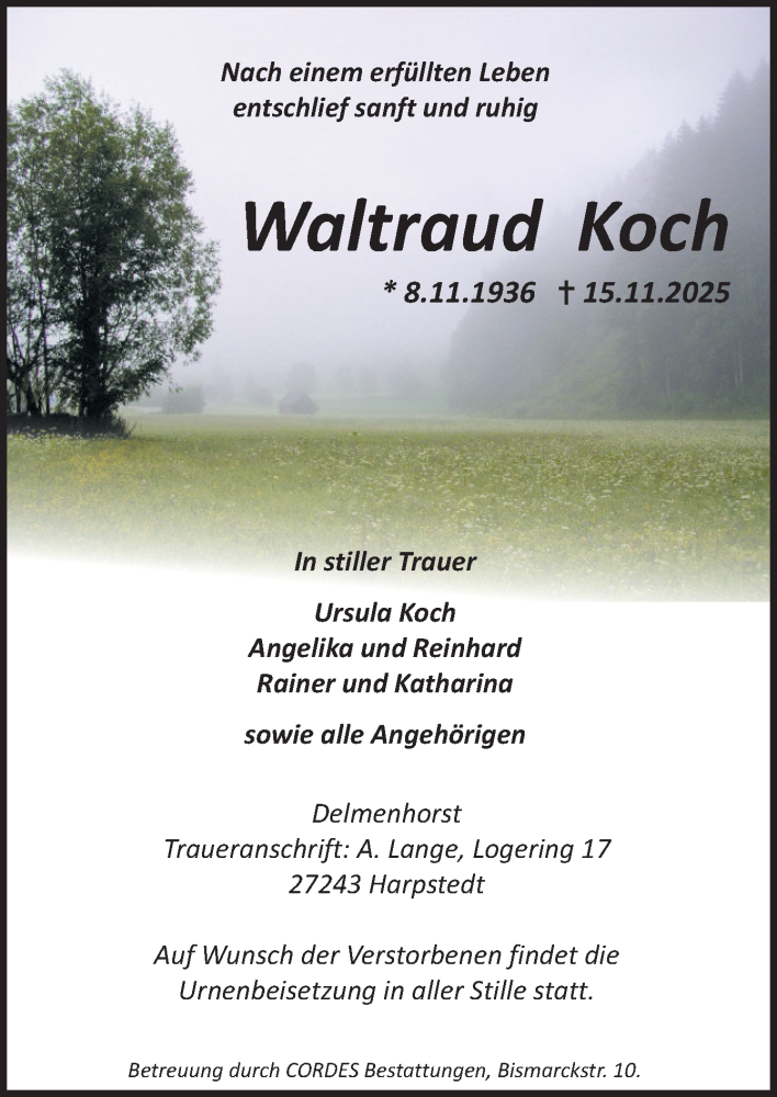 Hier finden Sie alle Traueranzeigen aus der Zeitung, die bisher für Waltraud Koch erschienen sind. Weitere Traueranzeigen, die in der Zeitung erscheinen, werden hier ebenfalls aufgelistet
