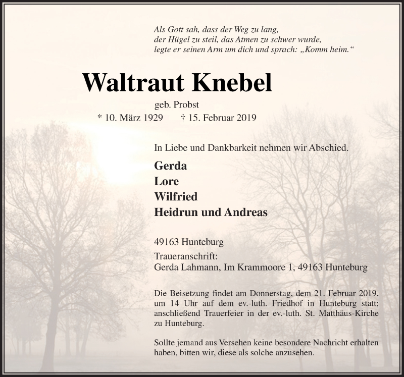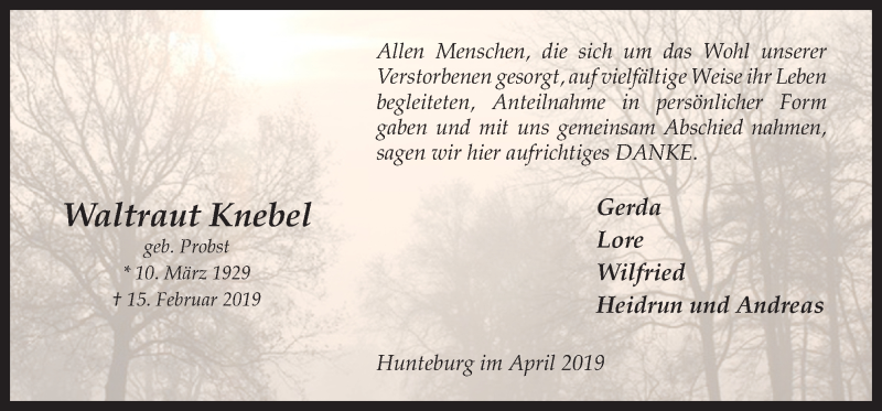 Hier finden Sie alle Traueranzeigen aus der Zeitung, die bisher für Waltraut Knebel erschienen sind. Weitere Traueranzeigen, die in der Zeitung erscheinen, werden hier ebenfalls aufgelistet