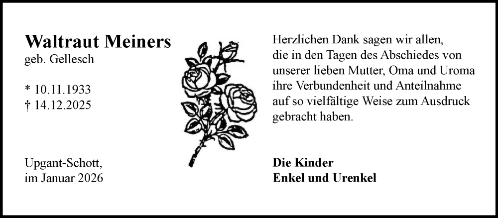 Hier finden Sie alle Traueranzeigen aus der Zeitung, die bisher für Waltraut Meiners erschienen sind. Weitere Traueranzeigen, die in der Zeitung erscheinen, werden hier ebenfalls aufgelistet