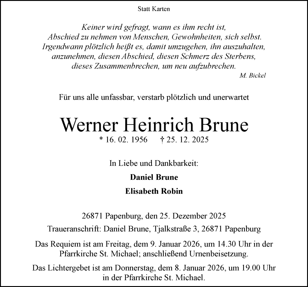 Hier finden Sie alle Traueranzeigen aus der Zeitung, die bisher für Werner Heinrich Brune erschienen sind. Weitere Traueranzeigen, die in der Zeitung erscheinen, werden hier ebenfalls aufgelistet