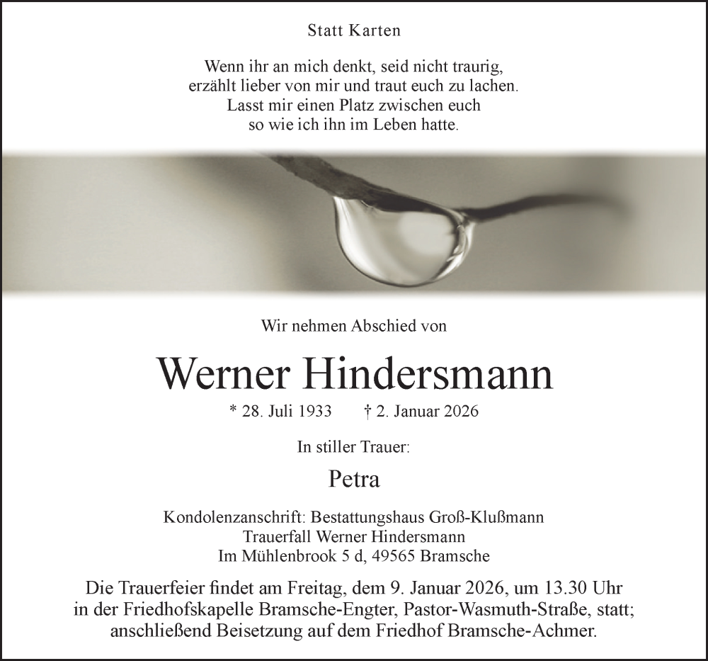 Hier finden Sie alle Traueranzeigen aus der Zeitung, die bisher für Werner Hindersmann erschienen sind. Weitere Traueranzeigen, die in der Zeitung erscheinen, werden hier ebenfalls aufgelistet