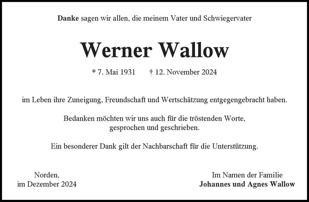 Hier finden Sie alle Traueranzeigen aus der Zeitung, die bisher für Werner Wallow erschienen sind. Weitere Traueranzeigen, die in der Zeitung erscheinen, werden hier ebenfalls aufgelistet