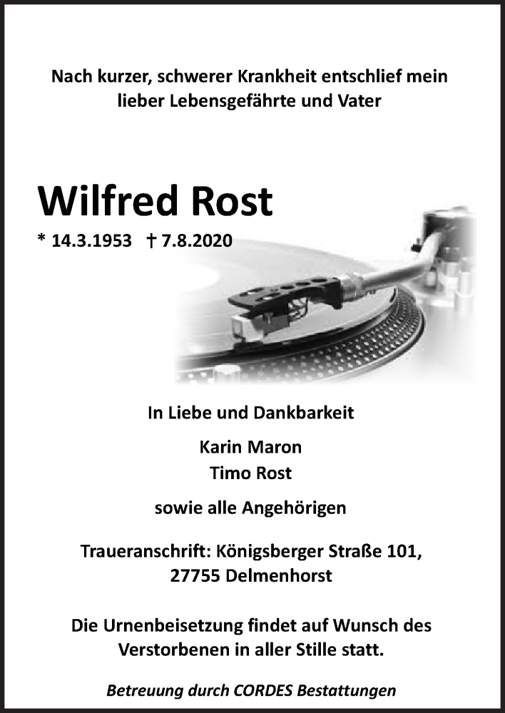 Hier finden Sie alle Traueranzeigen aus der Zeitung, die bisher für Wilfred Rost erschienen sind. Weitere Traueranzeigen, die in der Zeitung erscheinen, werden hier ebenfalls aufgelistet