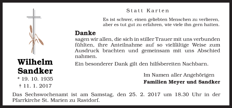 Hier finden Sie alle Traueranzeigen aus der Zeitung, die bisher für Wilhelm Sandker erschienen sind. Weitere Traueranzeigen, die in der Zeitung erscheinen, werden hier ebenfalls aufgelistet