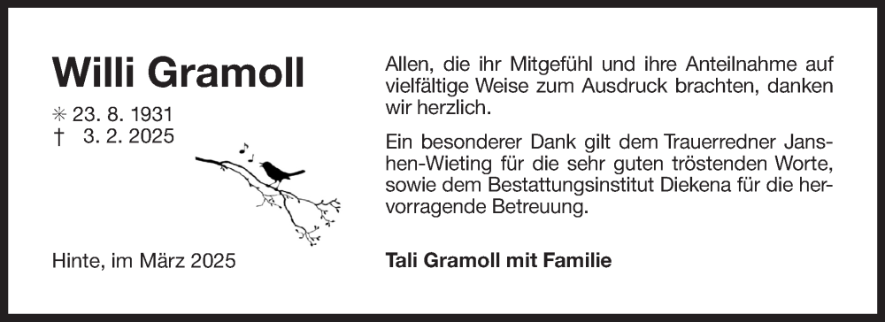 Hier finden Sie alle Traueranzeigen aus der Zeitung, die bisher für Willi Gramoll erschienen sind. Weitere Traueranzeigen, die in der Zeitung erscheinen, werden hier ebenfalls aufgelistet