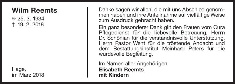 Hier finden Sie alle Traueranzeigen aus der Zeitung, die bisher für Wilm Reemts erschienen sind. Weitere Traueranzeigen, die in der Zeitung erscheinen, werden hier ebenfalls aufgelistet