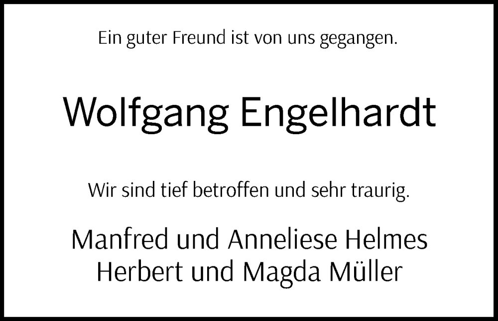 Hier finden Sie alle Traueranzeigen aus der Zeitung, die bisher für Wolfgang Engelhardt erschienen sind. Weitere Traueranzeigen, die in der Zeitung erscheinen, werden hier ebenfalls aufgelistet